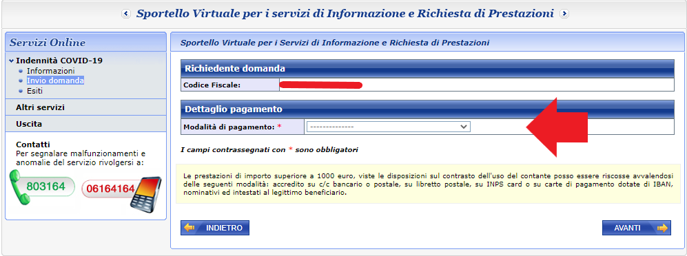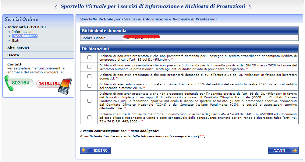 Selezionare il tipo di indennità da richiedere